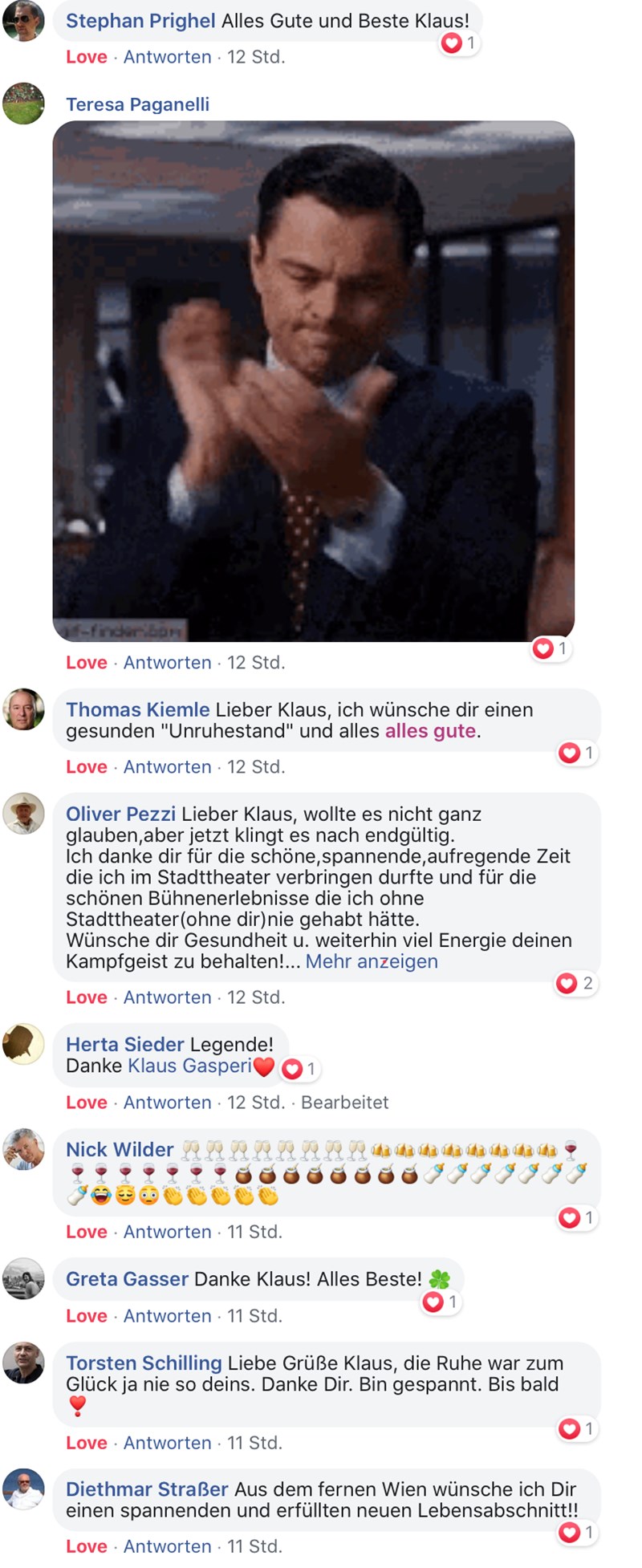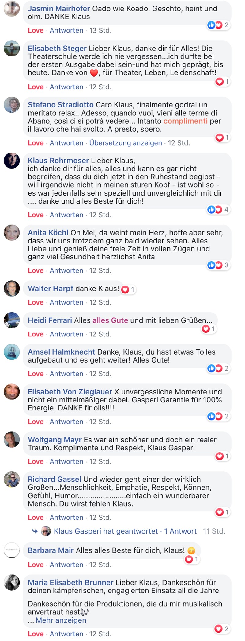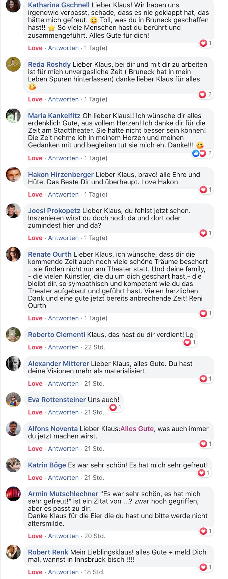 Lieber Klaus, lieber Jan, lieber Jiří, und alle im „Hintergrund“ Beteiligten – ihr sollt hochleben, lasst euch von ganzem Herzen gratulieren und danken für euren Einsatz, der einmalig und unbezahlbar ist! Und den wir Schauspieler ebenso wie das Publikum aufrichtig bewundern.
