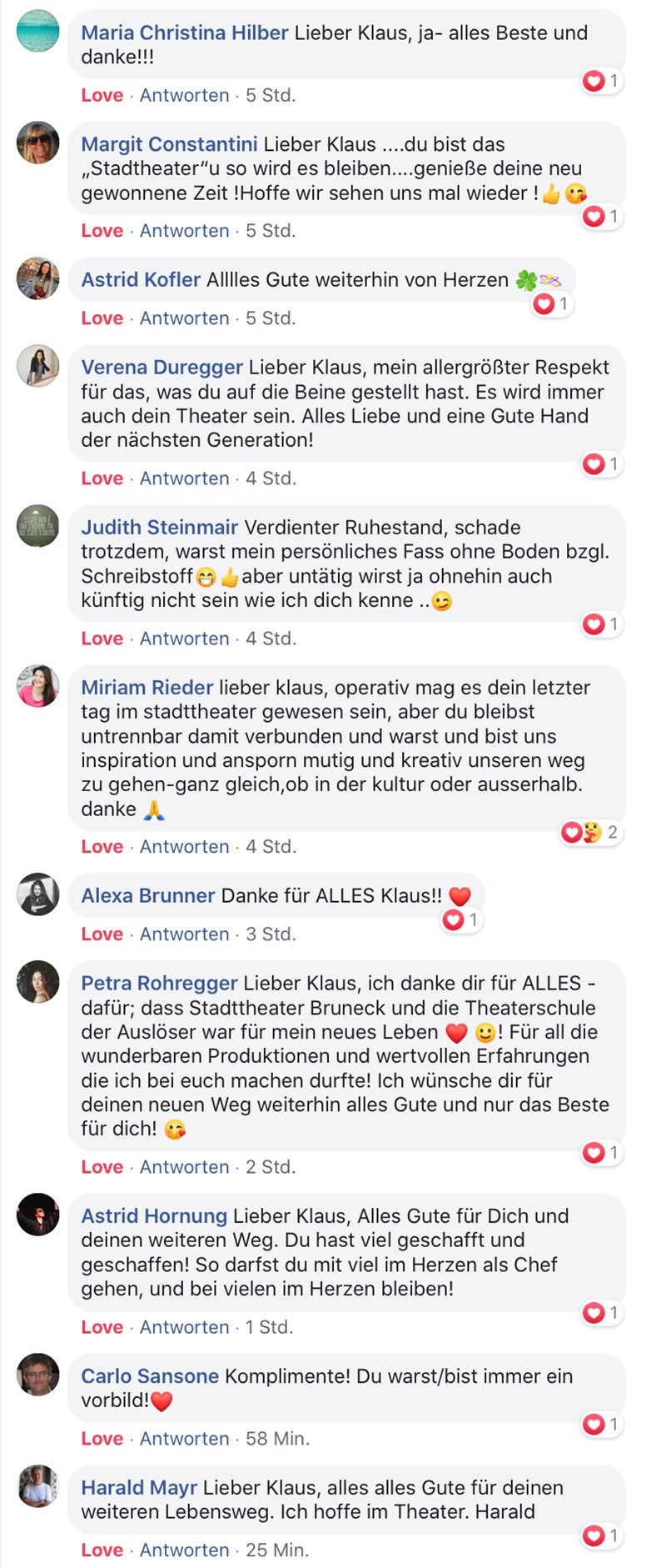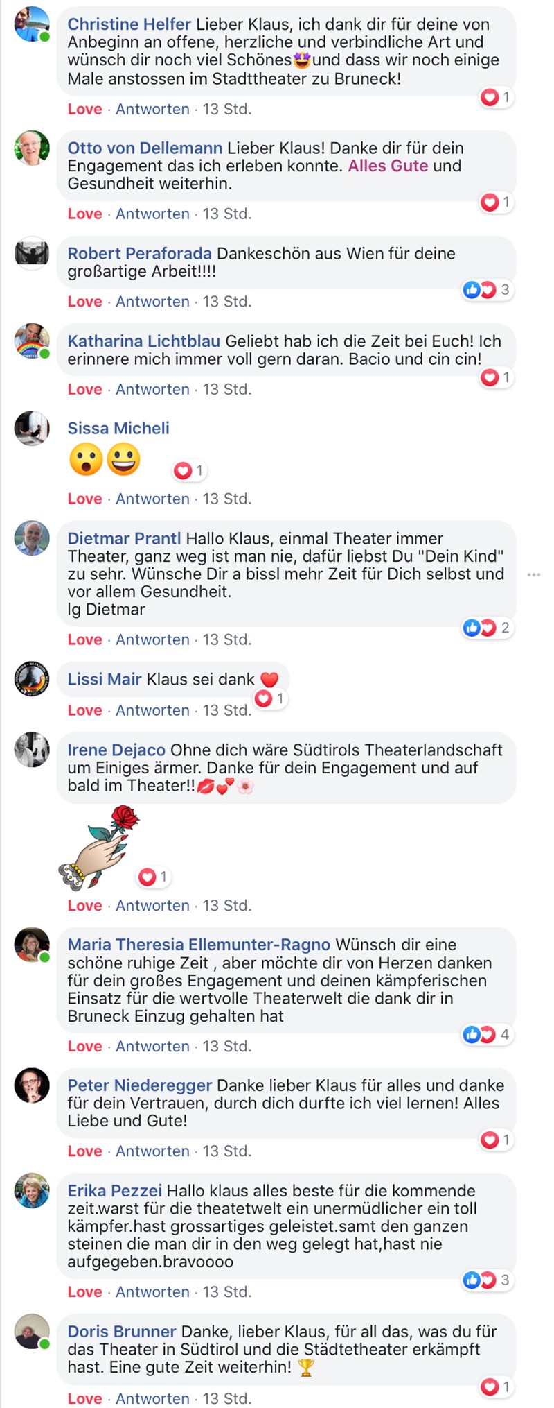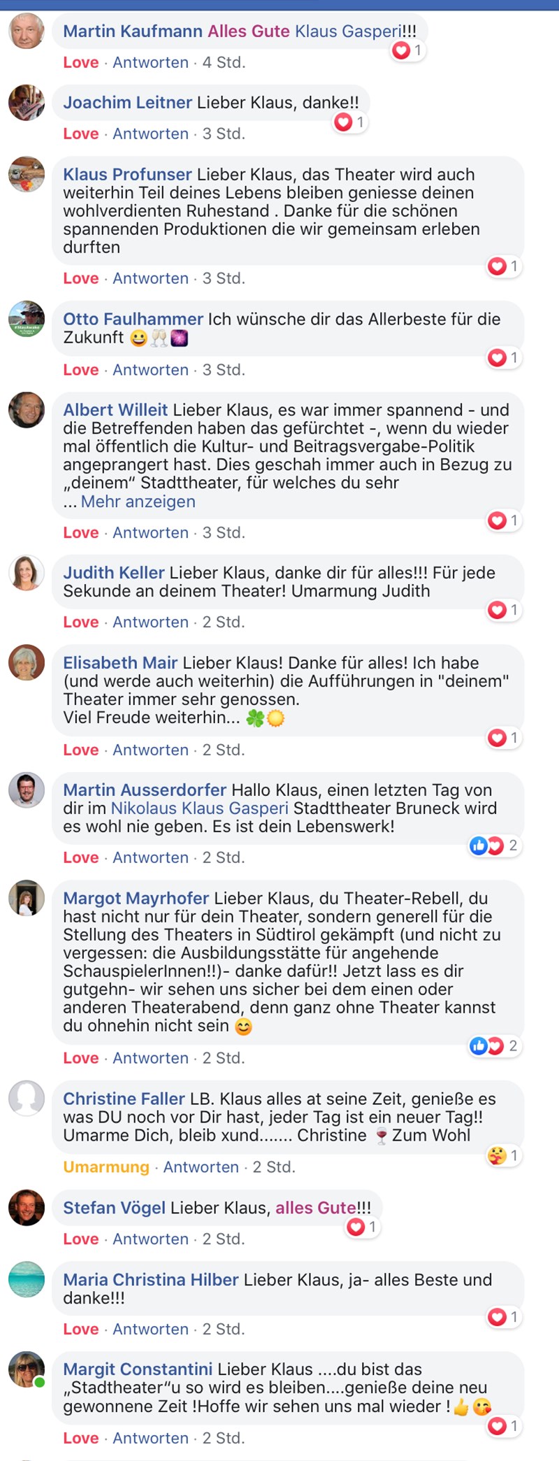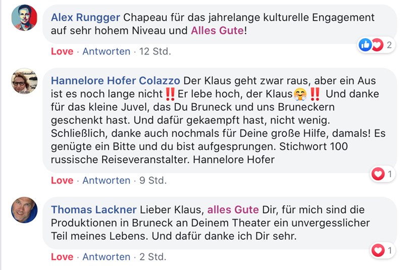 Die erbrachten Leistungen verdienen Lob und Anerkennung und in diesem Sinne ist es mir eine groBe Freude, stellvertretend für viele Freundinnen und Freunde des Stadttheaters zu gratulieren und alles erdenklich Gute zu wünschen. Alles Gute für eine Zukunft, in der mit Unterstützung der öffentlichen Hand das Kolpinghaus zu einer neuen Theaterspielstätte unter der Leitung des Stadttheaters Bruneck umgebaut werden soll. Auf dass die Theaterszene in Bruneck und weit darüber hinaus noch lange bunte Blüten treibt.