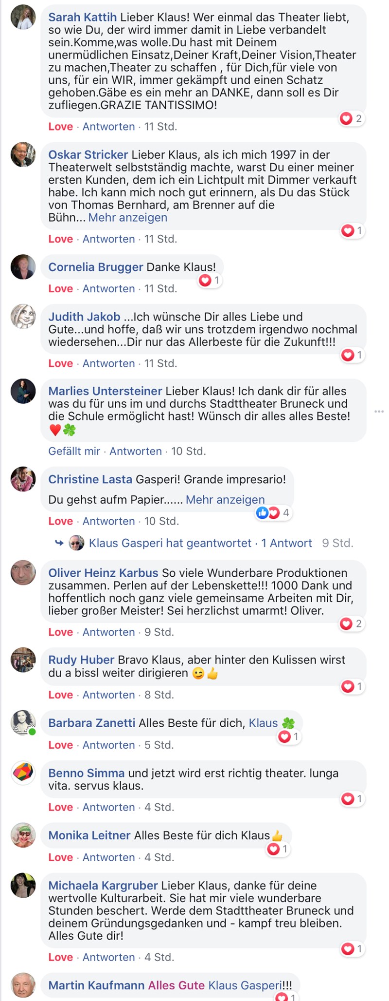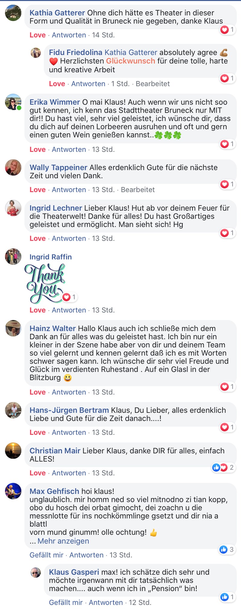 Das Stadttheater stellt einen enormen Mehrwert für unsere Gemeinschaft dar und dafür möchte ich mich bei allen, die im vergangenen Vierteljahrhundert dazu beigetragen haben, aufrichtig bedanken. Mein ganz besonderer Dank gilt dem künstlerischen Leiter Klaus Gasperi für sein schier unerschöpfliches Engagement rund um das Stadttheater Bruneck.