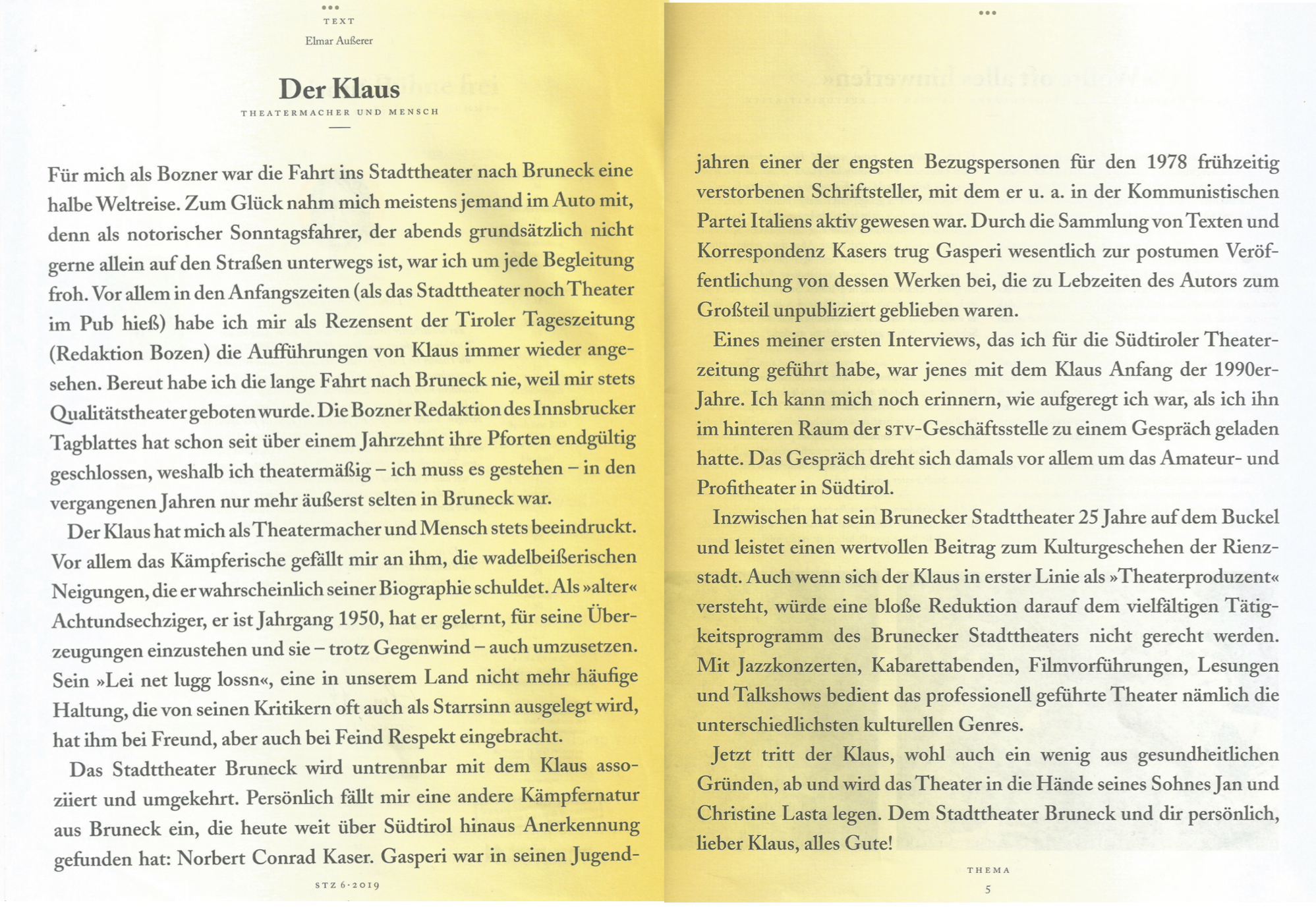 Es ist immer einer, ein Einzelner, der etwas unbedingt will und es dann auch macht. Der herausragende Bühnenbildner Klaus Gasperi wollte und macht nun seit 25 Jahren das Stadttheater Bruneck (vormals Theater im Pub). Mit stiller Leidenschaft, mit ebensolcher Begeisterung, mit gewaltigen Zornesausbrüchen manchmal, wenn der Kultur, dem Theater, seinem Theater, zu wenig Beachtung geschenkt wird, oder wenn man gar versuchte, es „abzudrehen“. Wie ja die sehr erfolgreiche Theaterschule tatsächlich abgedreht wurde.