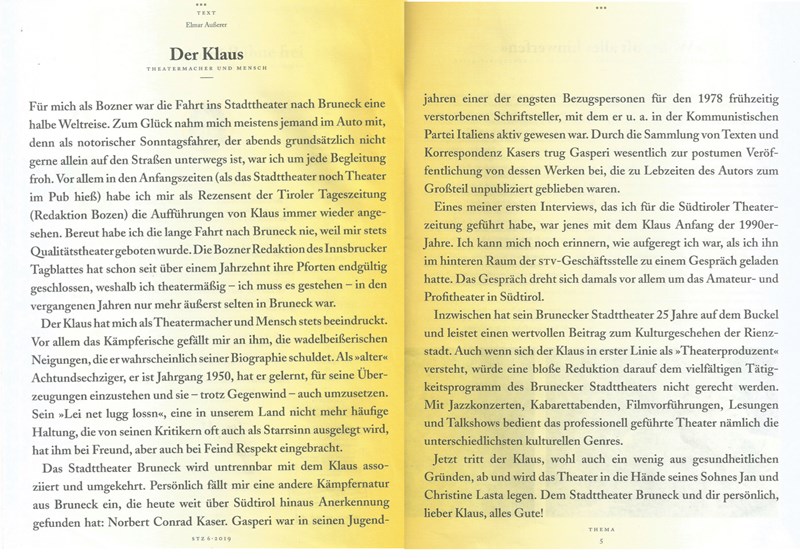nur zu gerne wäre ich heute bei der Feier zu 25 Jahre Stadttheater Bruneck dabei gewesen. Nicht nur, um Ihnen und allen voran Klaus Gasperi und seinem Sohn Jan meine persönliche Wertschätzung auszudrücken, sondern auch um wieder einmal diese besondere Atmosphäre des Brunecker Stadttheaters auszukosten. Geboren 1994 als „Theater im Pub" mit - so wurde mir gesagt - der ersten Drehbühne Südtirols, herangewachsen im Festzelt und schließlich niedergelassen im ehemaligen Sitze eines erfolgreichen Elektrikerbetriebes, elektrisiert das ,,Stadttheater Bruneck" noch wie vor seine Akteure wie Zuschauer. Die unkonventionelle, mitunter rebellischen, aufgeschlossenen, aufrüttelnden und nachdenklichen Züge, die das Stadttheater prägen, haben Südtirol gutgetan.