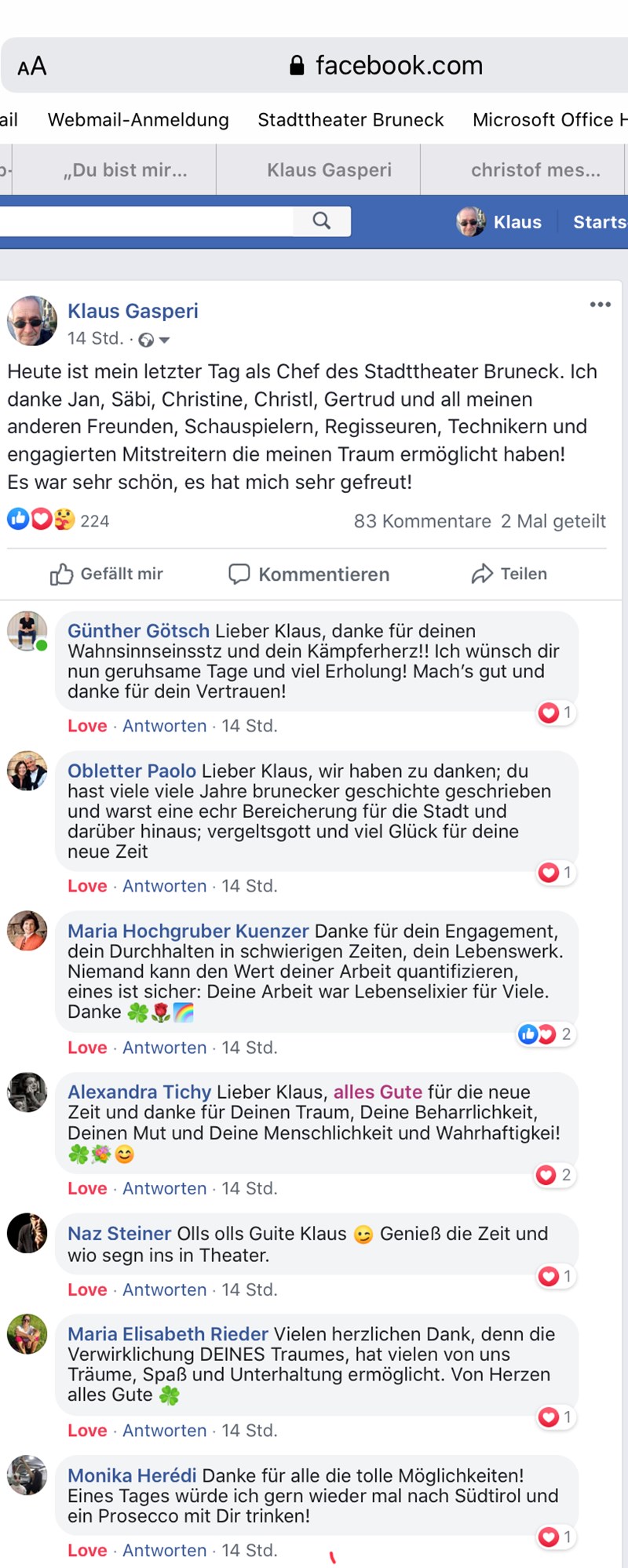 Und dazwischen die TheaterschülerInnen mit ihren Debüts auf der Bühne, für die Regie, aber auch für all die Arbeiten hinter den Kulissen, von denen die Zuseher kaum etwas erfahren. Das Wuseln der Jungen machte das Stadttheater Bruneck zu einem sehr lebendigen Ort, die Auszu- bildenden brachten neue Ideen und Netzwerke nach Bruneck, und von dort starteten viele ihre Engagements, durchaus erfolgreich. Das Netzwerken Klaus Gasperis muss auch noch erwähnt werden: Über ihn kamen viele Schauspieler und Regisseure nach Bruneck und Südtirol, die bis heute noch dort anzutreffen sind – auch ein Minderheitentheaterprojekt wurde initiiert und, so hoffe ich, weitergeführt. Und die politischen Pfeilspitzen, die vom Pustertal aus abgefeuert wurden ... sie freuen mich mehr als manche Aufführung zum Thema.