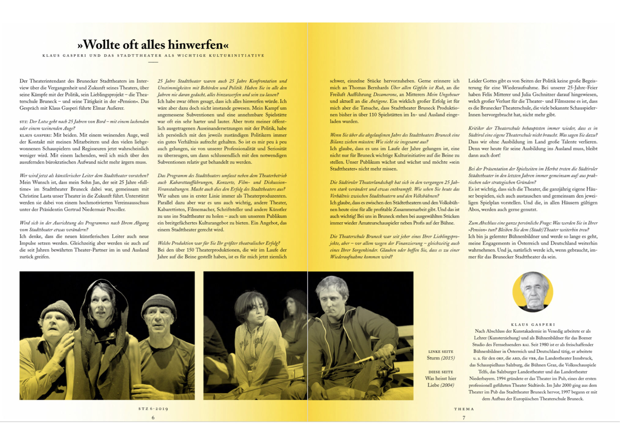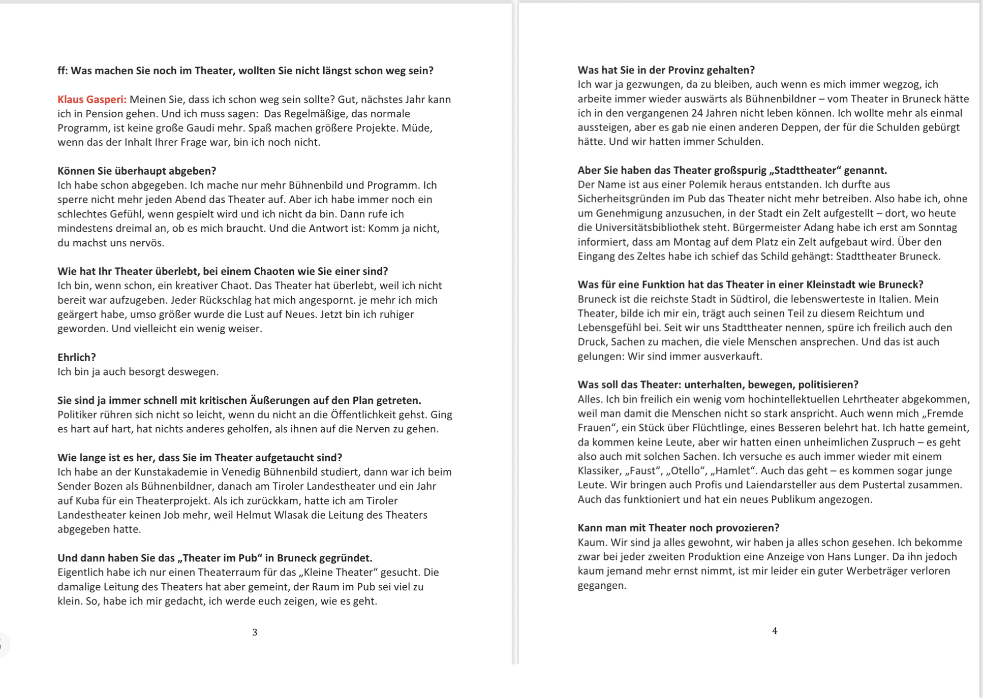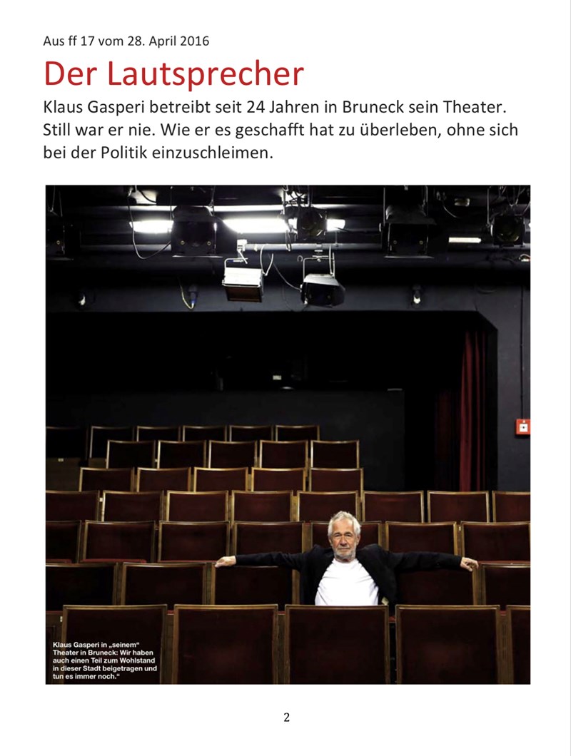 „Bruneck ist die reichste Stadt in Südtirol, die lebenswerte Kleinstadt in Italien. Mein Theater, bilde ich mir ein, trägt auch seinen Teil zu diesem Reichtum und Lebensgefühl bei. Seit wir uns Stadttheater nennen, spüre ich freilich auch den Druck, Sachen zu machen die viele Menschen ansprechen - und das ist auch gelungen!