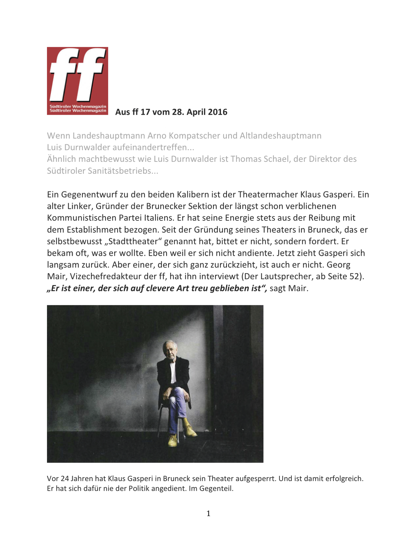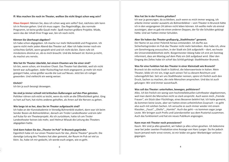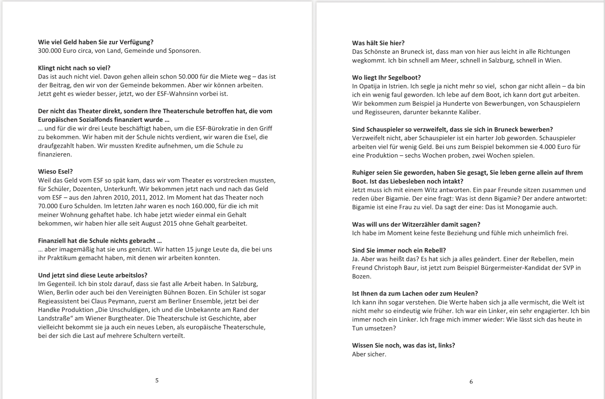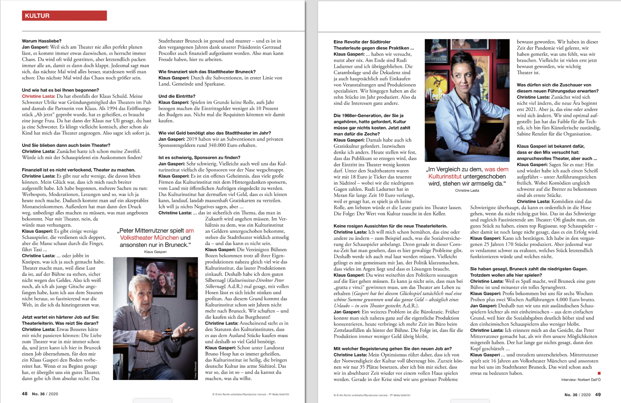 „Bruneck ist die reichste Stadt in Südtirol, die lebenswerte Kleinstadt in Italien. Mein Theater, bilde ich mir ein, trägt auch seinen Teil zu diesem Reichtum und Lebensgefühl bei. Seit wir uns Stadttheater nennen, spüre ich freilich auch den Druck, Sachen zu machen die viele Menschen ansprechen - und das ist auch gelungen!