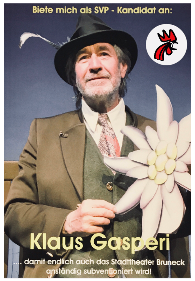 Mit einem satirischem Plakat hat Klaus Gasperi, Direktor des Stadttheaters Bruneck, seine Kandidatur bei der SVP angeboten. UT24 sprach mit Gasperi über sein nicht ganz ernstgemeintes Angebot, ob in Bruneck wirklich zu wenig für Kultur getan wird und was ihn an der Finanzierung des neuen Photomuseums stört.