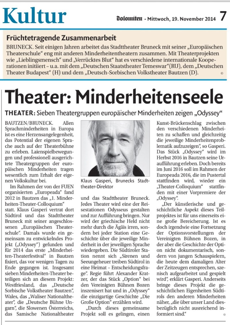 Bei dem Treffen in Bruneck ist nun der Startschuss für das ehrgeizige Projekt gefallen, das bis 2021 dauern und in den Ländern aller beteiligten Theater aufgeführt werden soll. Und so haben in den vergangenen Tagen acht Sprachminderheitentheater aus Deutschland, Wales, Belgien, Polen, Serbien, der Ukraine und Kroatien gemeinsam mit dem Stadttheater Bruneck an der Ausarbeitung dieses Großprojektes gefeilt. Theaterdirektor Klaus Gasperi zeigte sich mit dem Ergebnis äußerst zufrieden: