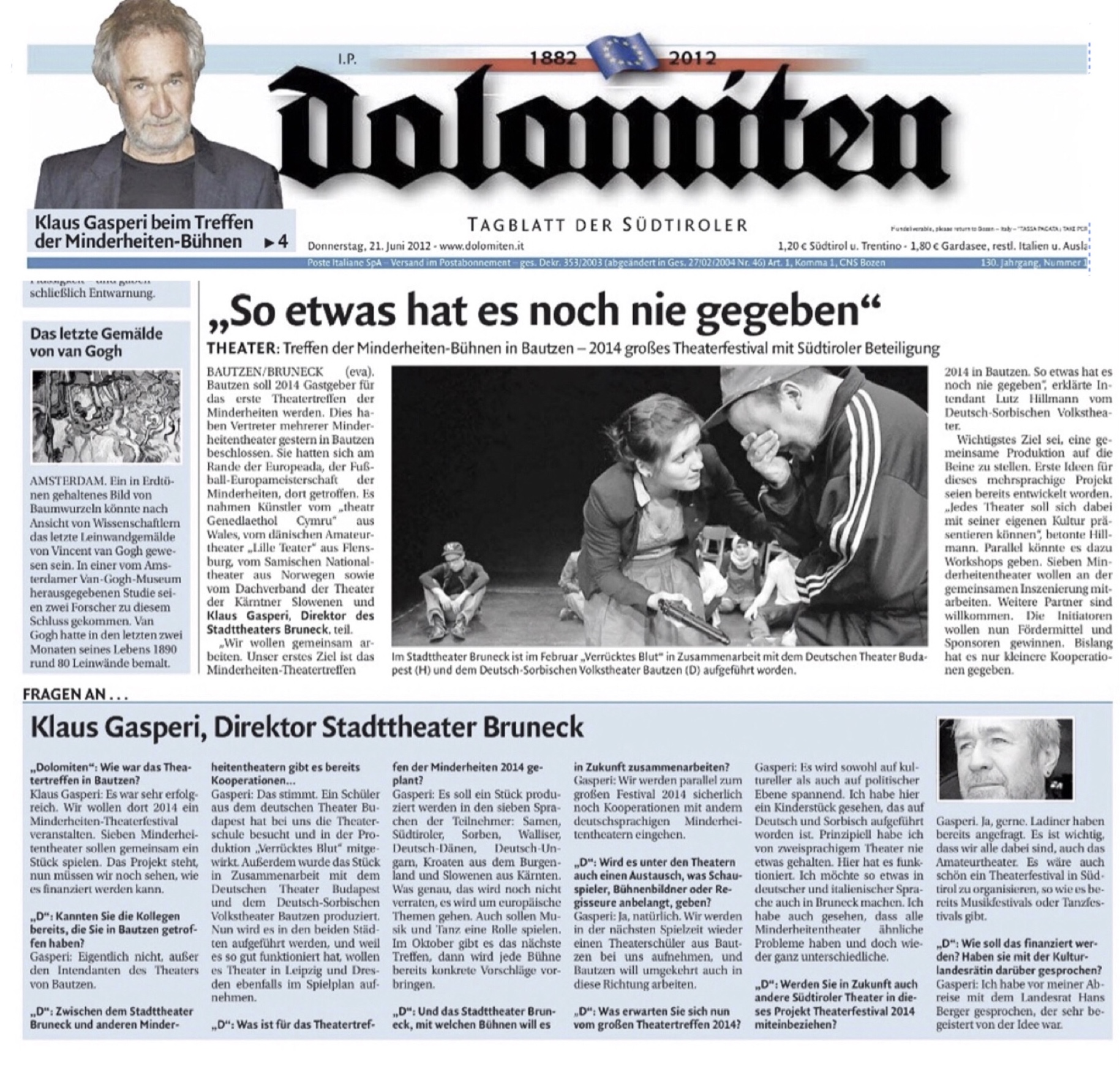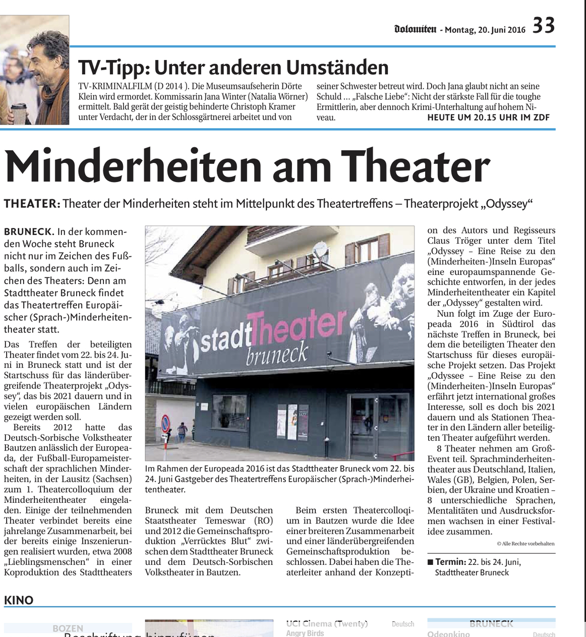 Noch bis Samstag, dem 25. Juni fungiert das Pustertal als Austragungsort der diesjährigen Euopeada, der Fußballeuropameisterschaft der autochthonen nationalen Minderheiten. Der Grundgedanke der Begegnung und des Austausches mit anderen Minderheiten lag auch dem Theatertreffen der Europäischer (Sprach-)Minderheitentheater zugrunde, das dieser Tage im Rahmen der Europeada mit dem Stadttheater Bruneck als Gastgeber stattfand.