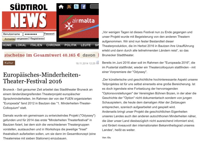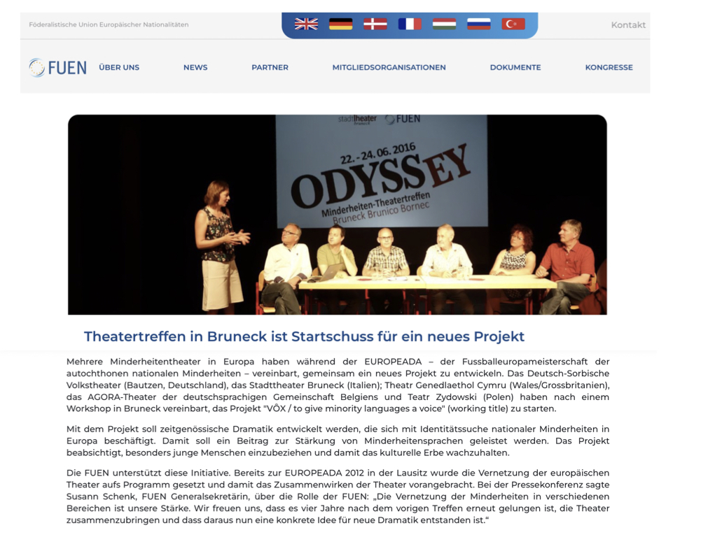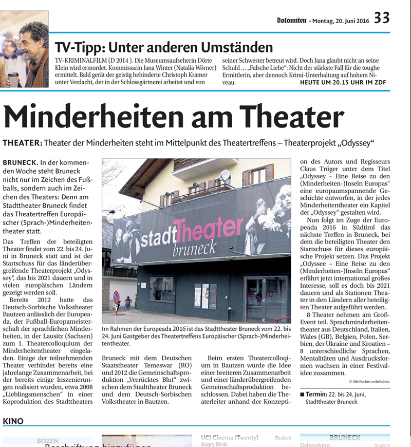 Bereits 2012 hatte das Deutsch-Sorbische Volkstheater Bautzen anlässlich der Europeada zum ersten „Theatercolloquium“ der Minderheitentheater eingeladen mit dem Ziel, ein Theaterfestival der Minderheiten zu etablieren. Diesem Treffen gingen bereits einige gemeinsame Produktionen voraus, wie beispielsweise „Lieblingsmenschen“ (Stadttheater Bruneck/Deutsches Staatstheater Temeswar, 2008) oder „Verrücktes Blut“ (Stadttheater Bruneck/Deutsch-Sorbisches Volkstheater Bautzen, 2012). Dabei reifte bei den Vertretern verschiedener europäischer Minderheitentheater die Idee einer länderübergreifenden Gemeinschaftsproduktion, fußend auf einer Konzeption des Autors und Regisseurs Claus Tröger. „Odyssey – Eine Reise zu den (Minderheiten-)Inseln Europas“ soll das Stück heißen, eine europaumspannende Geschichte, in der jedes beteiligte Minderheitentheater ein Kapitel der „Odyssey“ gestalten wird.