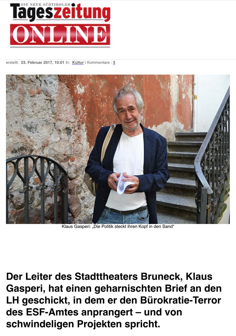 Schützenhilfe bekommt der wütende Theatermacher von zahlreichen Unterstützern aus dem Kulturbereich. „Was für ein Armutszeugnis wäre das, wenn die Südtiroler Landesregierung der Theaterschule Bruneck jetzt nicht aus der Patsche helfen würde. Was für eine Geringschätzung unseres Berufsstandes! Es geht hier um den einzigen Ort, an dem man sich in Südtirol zum Schauspieler ausbilden lassen kann“, kommentiert der bekannte Südtiroler Schauspieler und Regisseur Georg Clementi die Causa Theaterschule. Von Seiten der Intendanz (Irene Girkinger) und der Dramaturgie (Ina Tartler) der VBB kommt ebenfalls eine eindringliche Befürwortung für den Weiterbestand der Theaterschule in Bruneck: „Sie ist für die weitere Professionalisierung der Südtiroler Theaterlandschaft essenziell, wir brauchen junge, gut ausgebildete Talente aus der Region auf unseren Bühnen. Der Untergang der Schule wäre ein enormer Verlust sowohl für das Stadttheater Bruneck als auch die anderen Bühnen Südtirols. Es wäre jammerschade um die enthusiastische Aufbauarbeit von Klaus Gasperi und seinem Team, und es ist eigentlich nicht zu verantworten, dass Studentinnen und Studenten, die noch ihre Abschlussprüfungen in Wien machen müssen, bald auf der Straße stehen.“