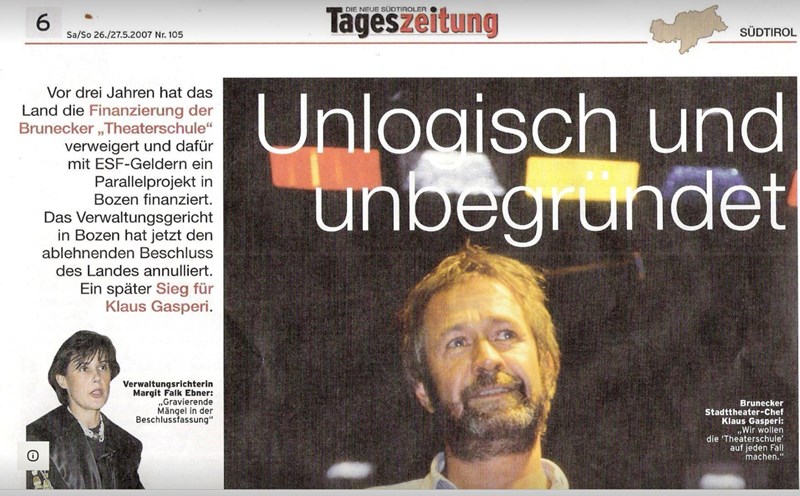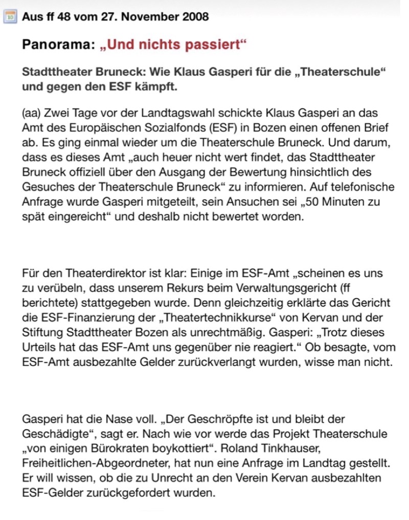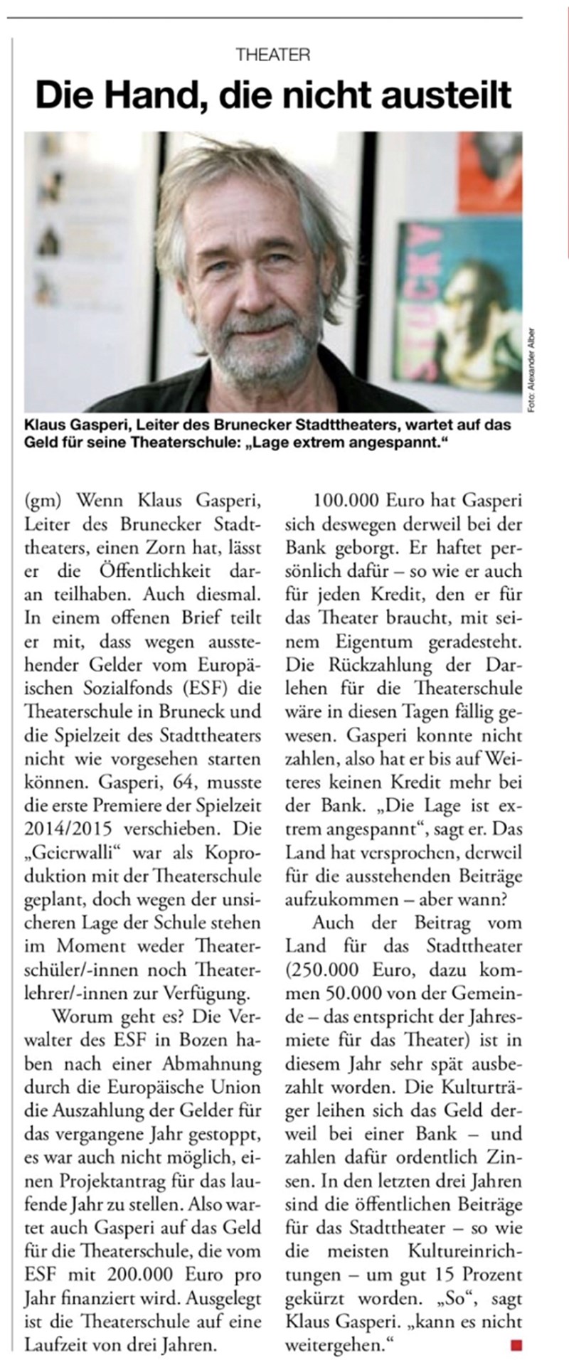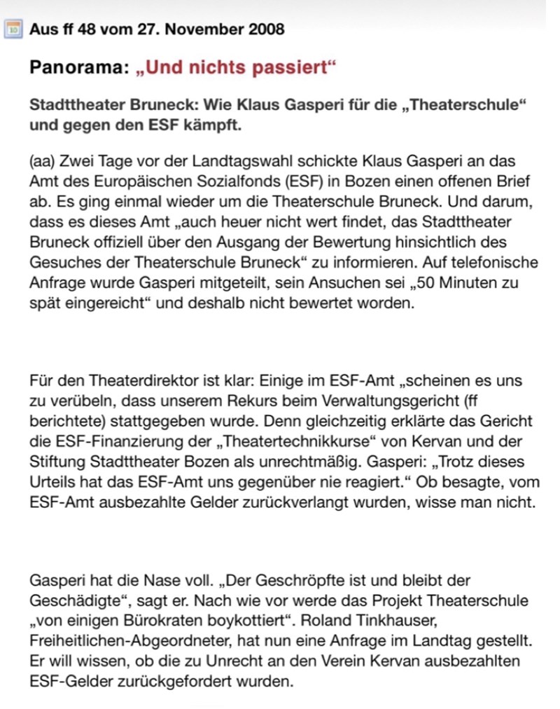 Unsere Schule, ein international anerkanntes Ausbildungs-Vorzeigebeispiel und Spitzenreiter bei den Prüfungserfolgen vor der Österreichischen Paritätischen Schauspielkommission in Wien, steht nun wegen Eurer „Vogel-Strauß-Politik" vor dem definitiven Aus!“ schreibt Gasperi in seinem offenen Brief. Was ihn ärgert: Solange die Schule vom ESF finanziert wurde, hätten etliche Südtiroler Institutionen, nicht nur im Theater- und ganz allgemein im Kulturbereich, sondern auch Tourismusorganisationen, Gemeinden und Landesämter auf das Know-how der Schule zurückgegriffen. Seit dem ESF-Skandal ist nun alles blockiert, und die Auszahlungen sind eingefroren. Auf stattliche 150.000 Euro beläuft sich die Summe beim Stadttheater Bruneck. Vier Mitarbeiter mussten angesichts des Stillstands bereits entlassen werden.