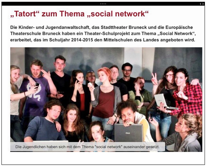 Sehr geehrter Herr Landeshauptmann, wir wissen alle, dass Sie den ESF-Skandal nur geerbt haben und Ihre Regierung nichts damit zu tun hat. Gerade wir vom Stadttheater Bruneck und unsere Schulabsolventen sind Ihnen und Landesrat Achammer immer noch dankbar, dass Sie es vor zwei Jahren ermöglicht haben, das letzte Schuljahr auch ohne ESF-Beitrag abzuschließen. Dies war wichtig und trägt heute seine Früchte: nicht nur alle professionellen Theater unseres Landes profitieren regelmäßig vom hohen Ausbildungsgrad unserer Absolventen, es gibt auch kaum einen Film, der in Südtirol gedreht wird, an dem nicht an unserer Schule ausgebildete Schauspieler engagiert sind.